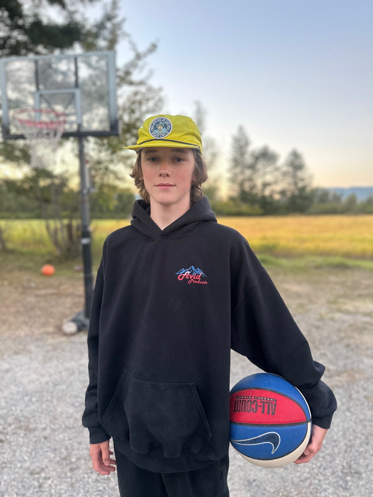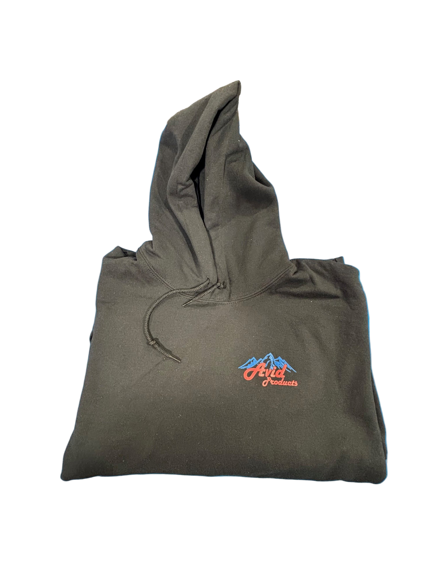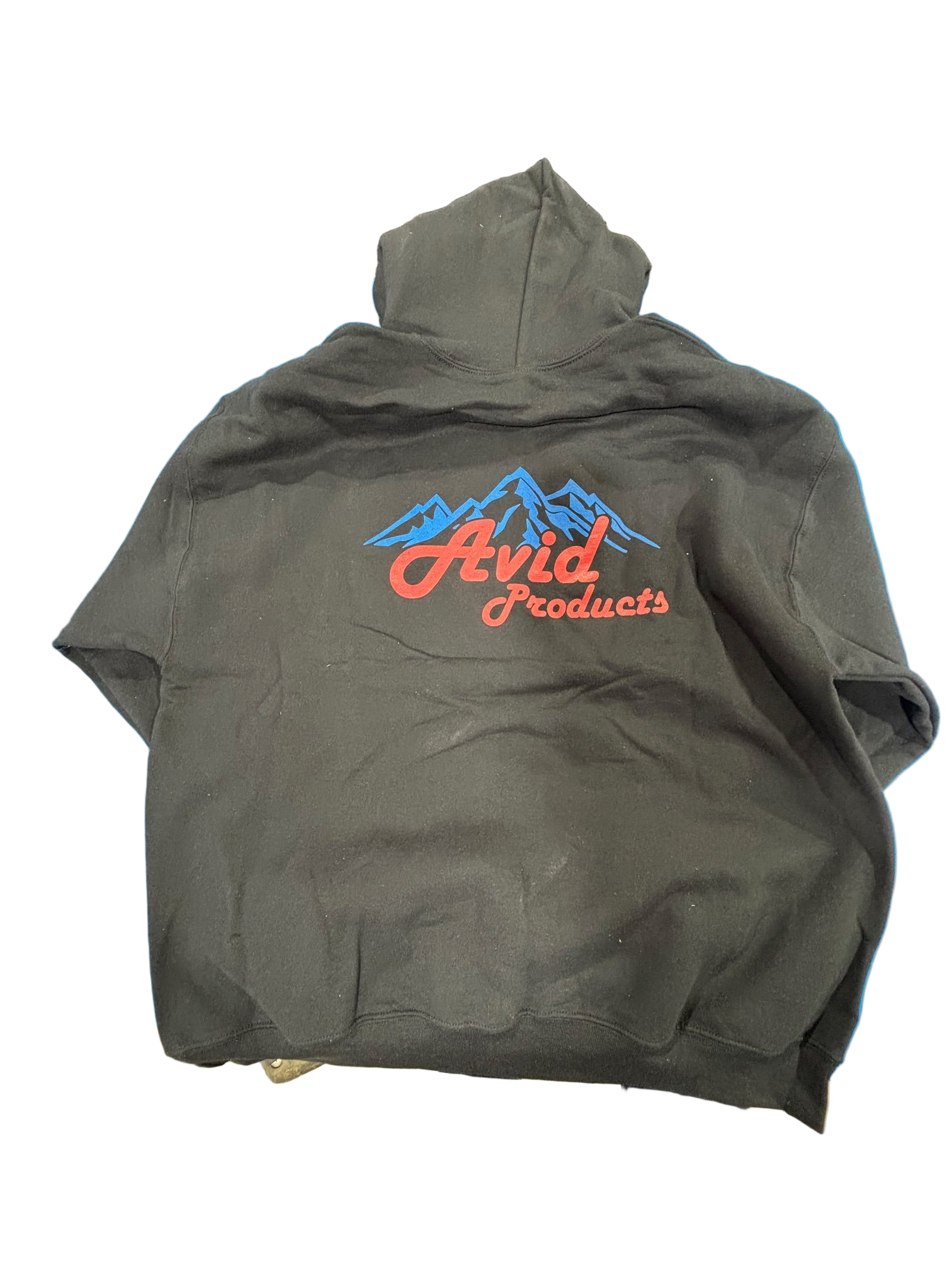 Durable, Gildan cotton hoodie. Great looking and extremely comfortable. These are black with our Red and Blue Mountain Logo front and back.